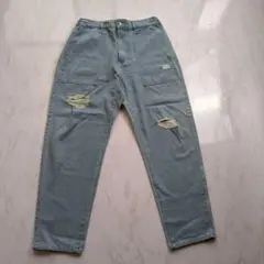 ライトブルーのダメージ加工が施されたカジュアルなデニムパンツ。
