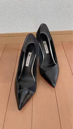 スエード素材の黒いハイヒール、赤いソールが特徴。