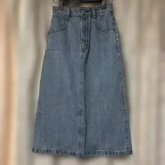 ダークデニムのスリット入りロングスカート、スタイリッシュなデザイン。