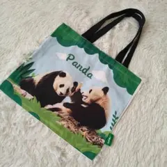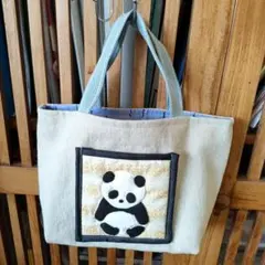 クリーム色のキャンバス素材トートバッグ、パンダのイラスト付きで可愛らしくシンプルなデザイン。