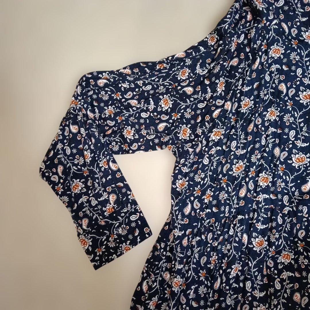 ネイビーの花柄シャツワンピース、長袖デザイン。