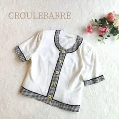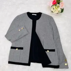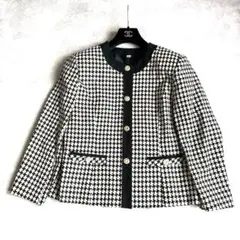 千鳥格子柄で丈は短めのノーカラージャケットです。