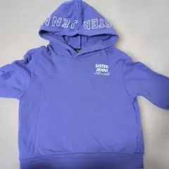 フルジップのグレーのフード付きパーカー、SISTER JENNIの蛍光グリーンロゴ付き。