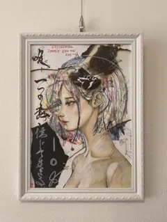 背景の建物のモチーフも含めて、明るさの裏に、少し陰りを感じさせる構成。額装は重厚な黒で、外枠の強さと内枠の白布との対比が、作品の軽妙さを引き立てている。全体として、レトロでありながらも単なる懐古ではなく、記憶の中で発酵したイメージのような深みを持っている。時間の層を感じる一作。