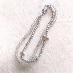 淡いパープルやピンク、ブルー系のビーズと、小さなパールチェーン、さらにハート型の留め具が組み合わされた、とてもロマンティックなブレスレットです
