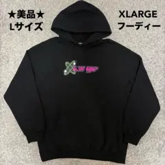 XLARGEのブラックパーカー、フロントとバックにユニークなキャラクターとロゴデザイン。