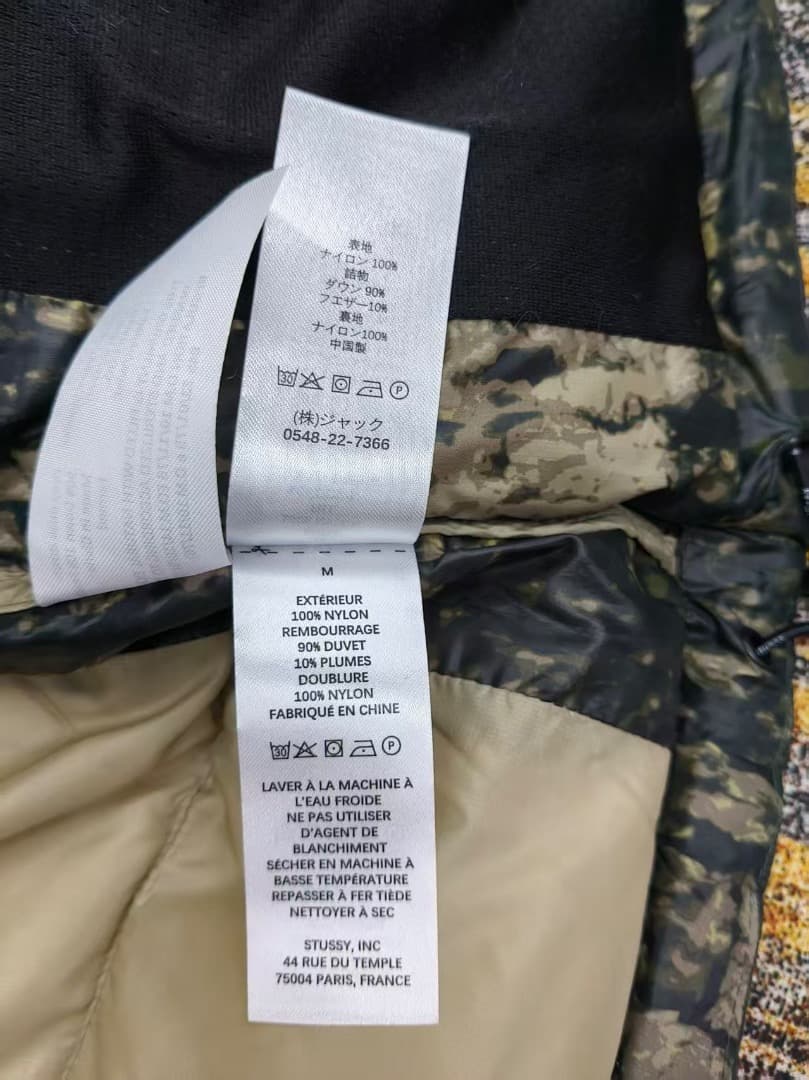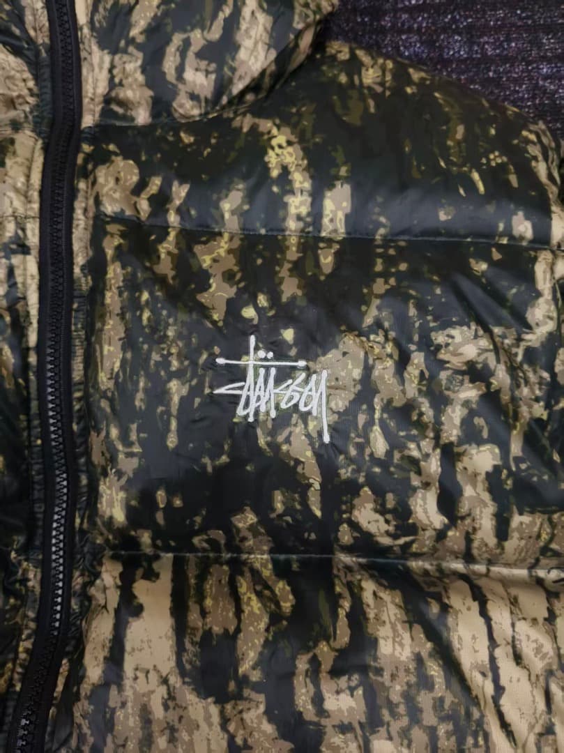 このStussyのダウンジャケットは、カモフラージュデザインが特徴で、ストリートファッションに最適です。
