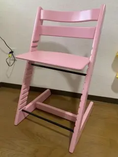 木製のハイチェアで、安全ベルト付き。高さ調整可能で、シンプルなデザインが特徴。