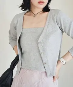 シンプルで着回しやすいグレーの長袖カーディガン。白い飾りボタンが可愛らしいです。