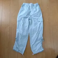 ベージュとパープルのスリムフィットパンツ、バックポケット付き、ゴムウエストで快適な着用感。