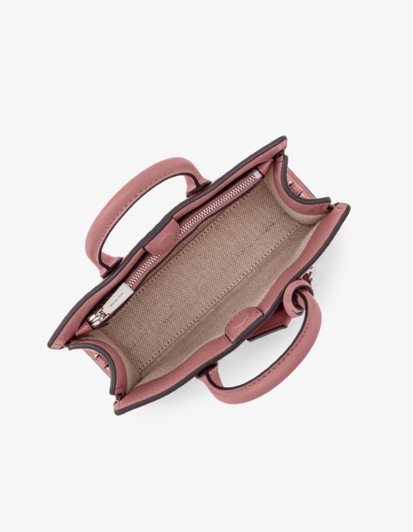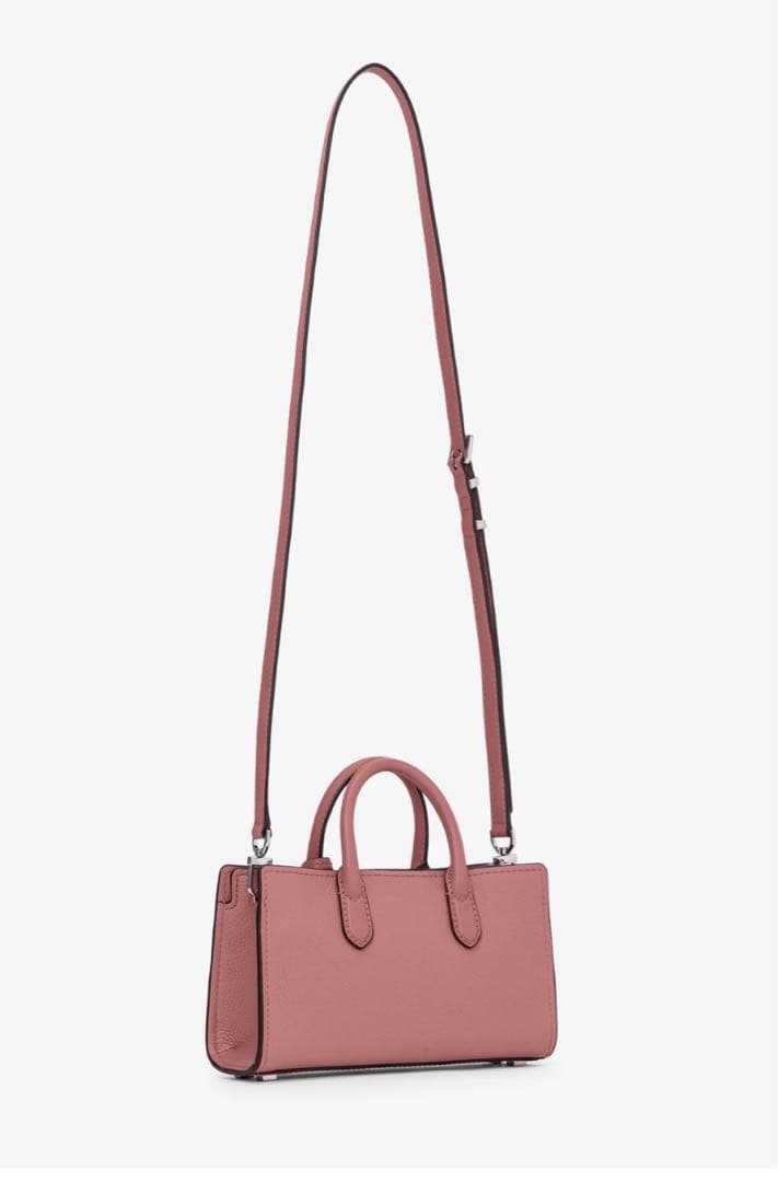 コンパクトなデザインで、調整可能なショルダーストラップ付きのローズピンクのクロスボディバッグ。