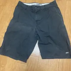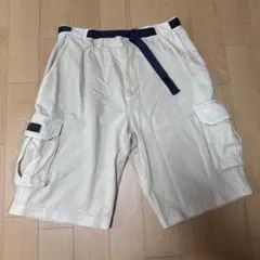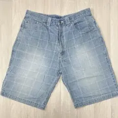 ストレッチ素材の青いショートパンツ、ポケット付きで実用的。