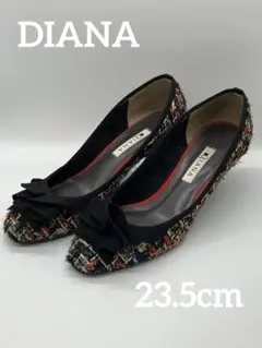 DIANA/ダイアナ ファー付き ツイード ローヒールパンプス リボン 赤系