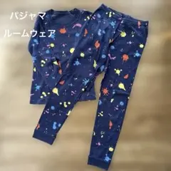 ネイビーとホワイトのストライプデザインの長袖パジャマセット、星柄の袖とウエストゴムのパンツ付き。