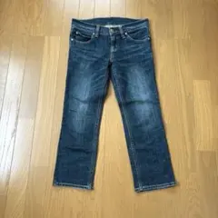 以前購入のお品です。ライトオンで購入しましたが、子供が履かなかったので新品未使用で自宅保管してました。ダメージ加工が施されたダークブルーのストレートデニムパンツ。