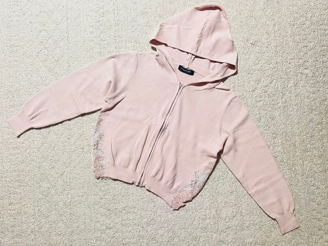 クイーンズコートのフード付きのピンクのジップアップニット、サイドにレース装飾付きで可愛い。