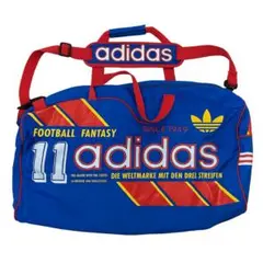 赤と黒のadidasボストンバッグ、調整可能なストラップと内部ポケット付き。