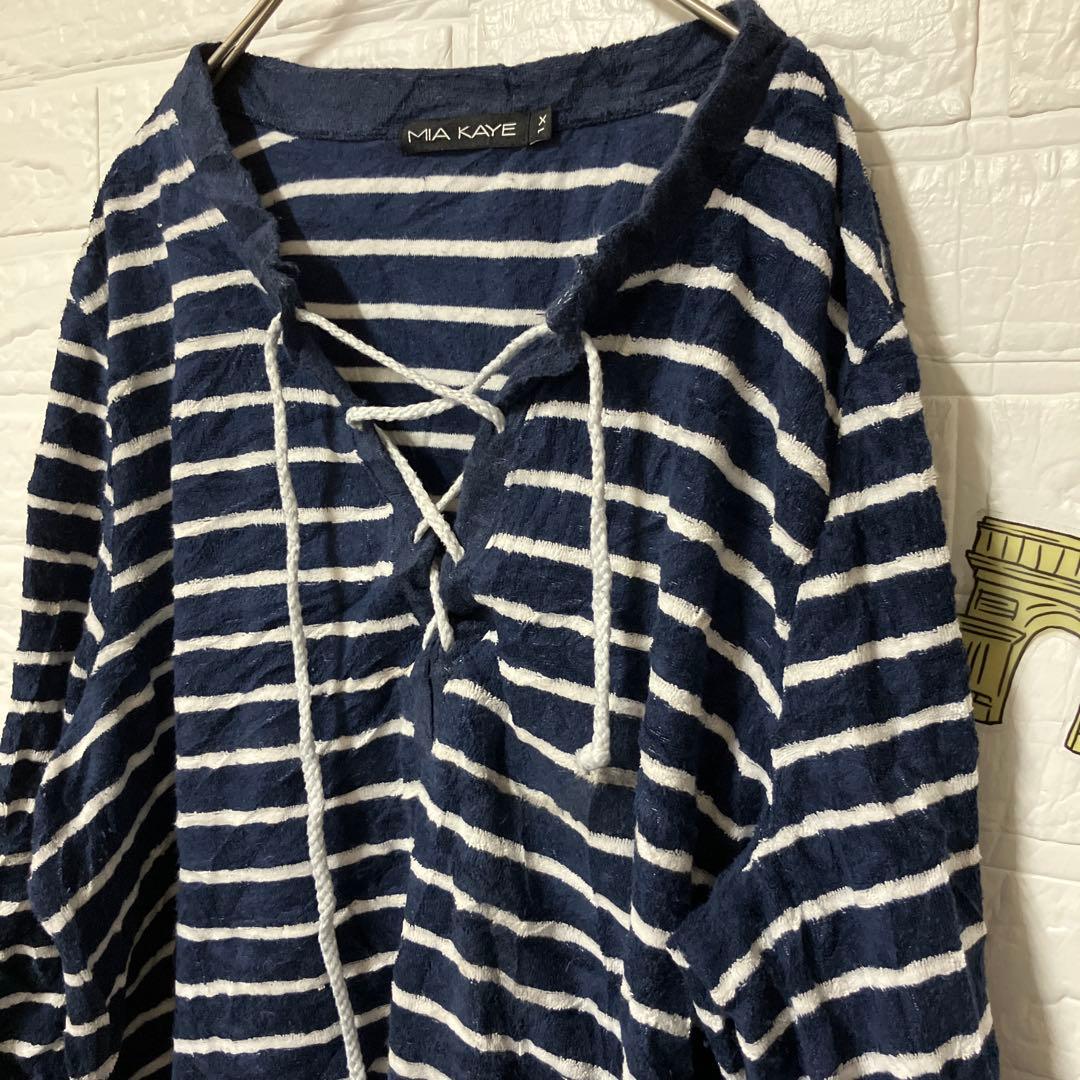 MIA KAYE ネイビー/ホワイトストライプ Tシャツ 【XL】