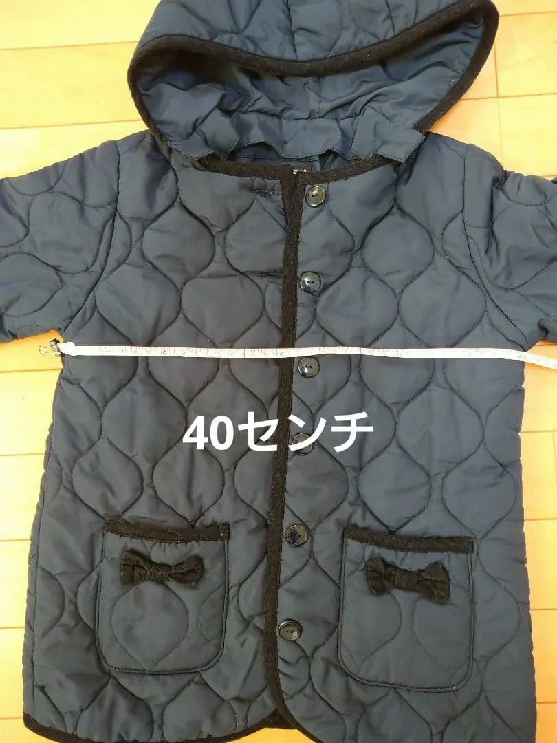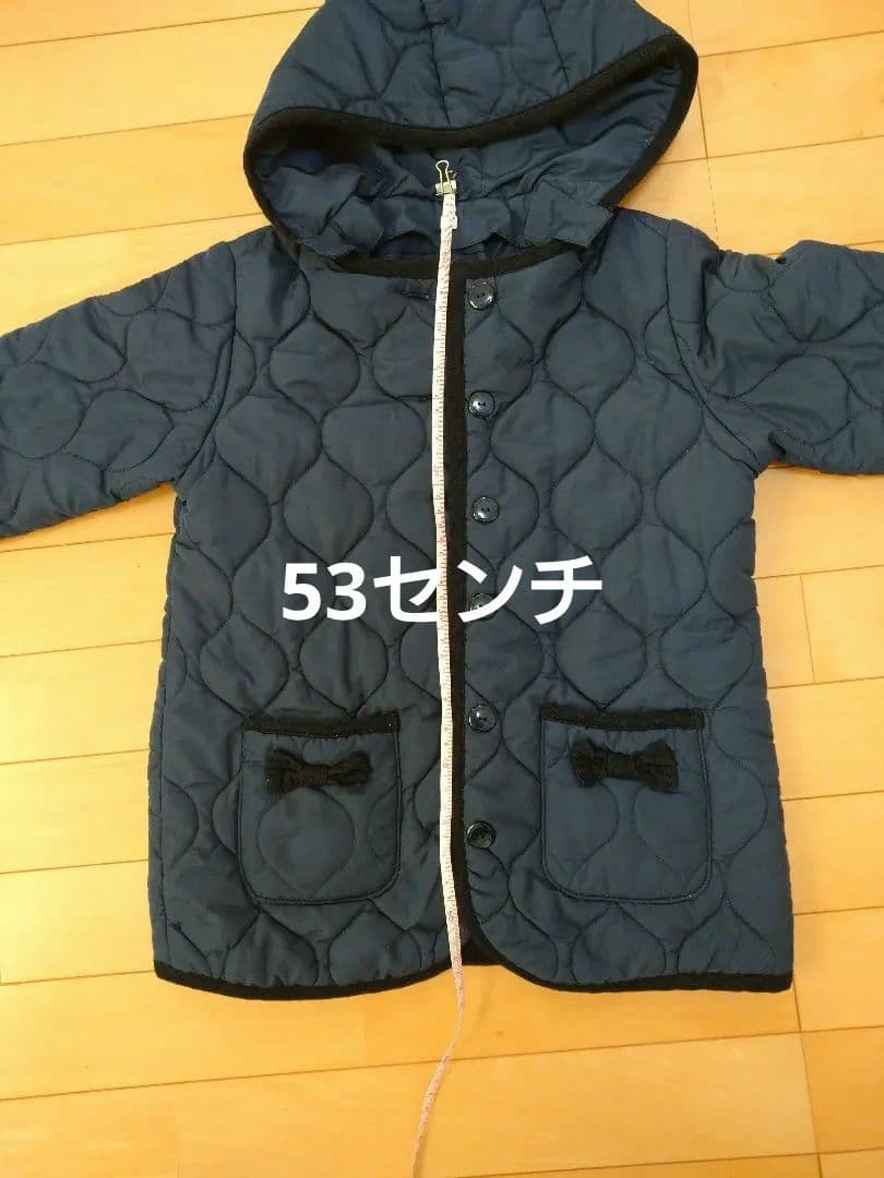 ネイビーのキルティングジャケット、フード付きです。