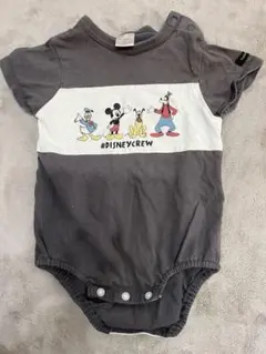 ミッキーとドナルドのプリントが特徴のダークグレーのロンパースです。