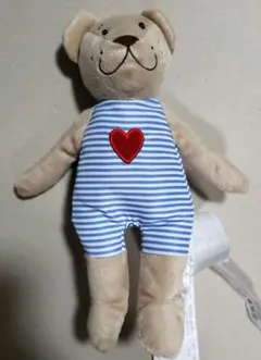 IKEAにて購入したクマの形状のぬいぐるみ、ストライプのオーバーオールと赤いハートが特徴。