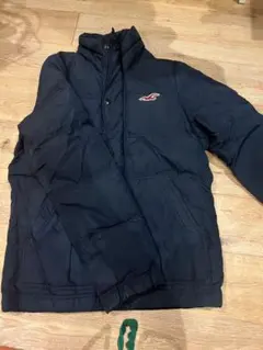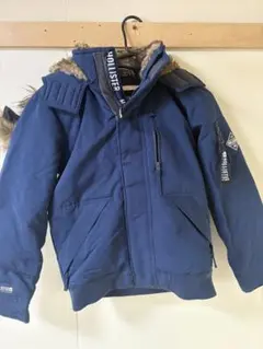フード付きのネイビーのダウンジャケット、ファー付きで保温性抜群。