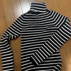黒と白のストライプのタートルネックニット、フィット感のあるデザインでスタイリッシュ。