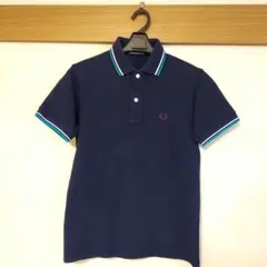 フレッドペリーのブラックポロシャツ、グリーンストライプの襟付き。