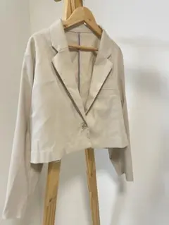 ベージュのチェック柄テーラードジャケット、前面に2つのポケット付き。