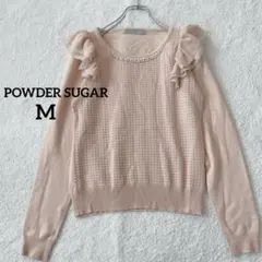 リブ編みのベージュセーター、フリルと黒い縁取りが特徴。