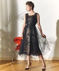 オフショルダーのフィット&フレアデザインの黒いパーティードレス。