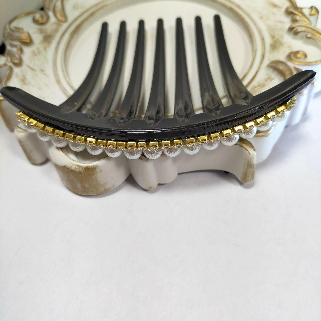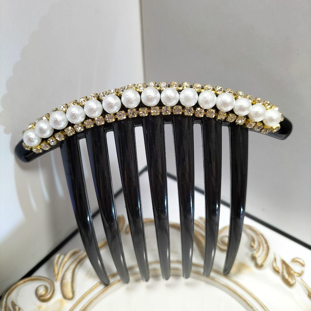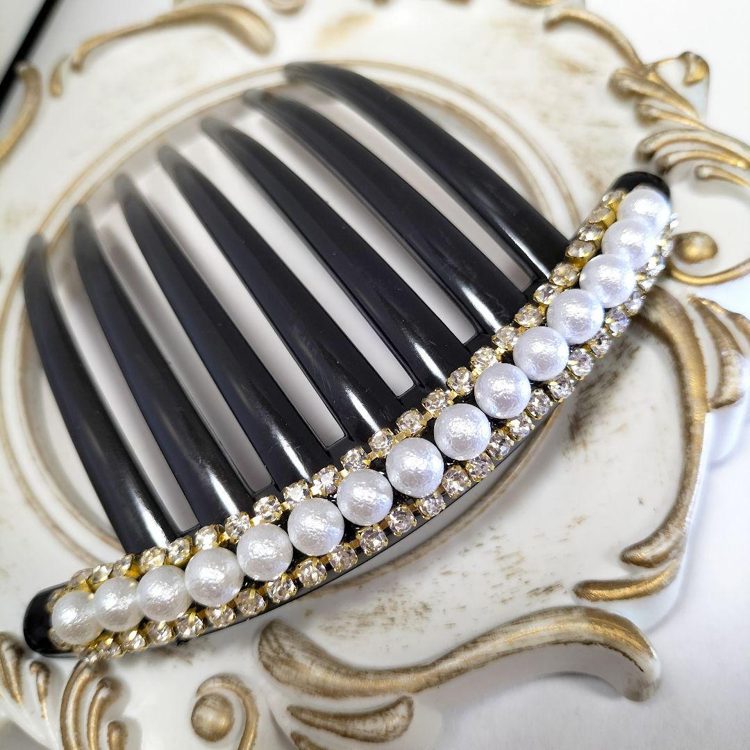 夜会巻きや、ヘアアップ、髪飾り等のヘアアレンジにいかがでしょうか?こちらは大変人気のコームになります。コットンホワイトパールとゴールドダイヤレーンで作成致しました。キラキラしております。