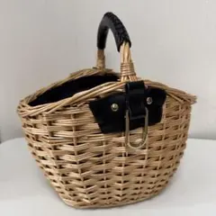 ストローとキャンバス素材のかごバッグ、レザー製ハンドル付き。