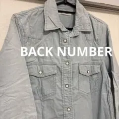 デニムブルーの長袖シャツ、胸ポケット付き、ラウンドヘムデザイン。