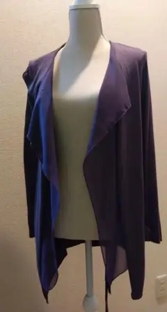 サテンのリボンにくるみボタン、後ろはウエストが絞ってある、素敵なカーディガンです。蛍光灯の下で検品してますが、汚れのない綺麗な中古品です。