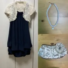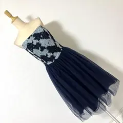 花柄やレース、淡いネイビーの色合いがエレガントなパーティードレス。