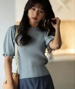 セゾンドパピオン グリーン リブ編み 半袖ニット