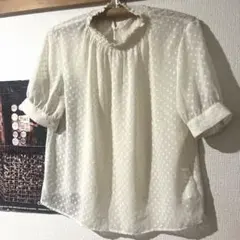 クリーム色のシースルー素材、リボン付きハイネックの半袖ブラウス。