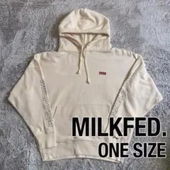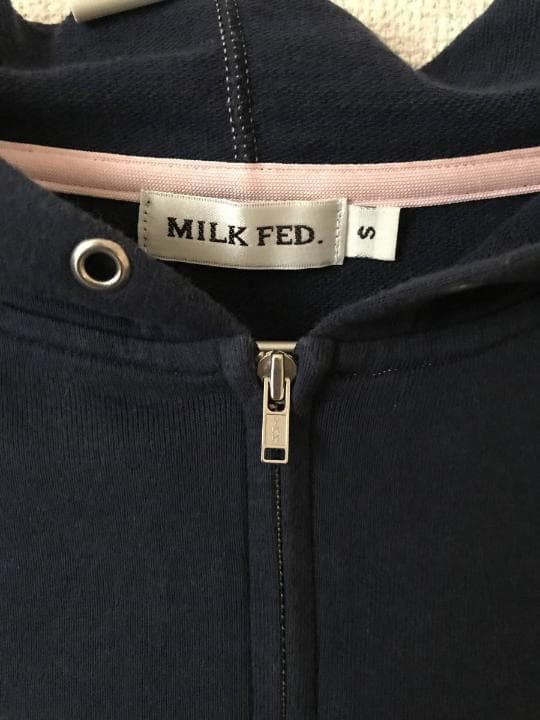 MILKFED. (ミルクフェド)の7分袖パーカーです。色はネイビー×ピンク 、サイズ:S(着丈54cm、身幅44cm)、素材:(表地)綿100%、(リブ部分)綿95%・ポリウレタン5% です。サイズはS表記ですが、普段9号Mサイズ着用でぴったりめの着用感です。2回程着用しホームクリーニング済み。目立つような汚れや傷はありませんが、多少の毛羽立ちなどはご容赦ください。 折りたたんで匿名配送でお送りします。