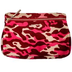 レオパード柄のナイロン製ポーチ、外側にファスナーポケット付き。