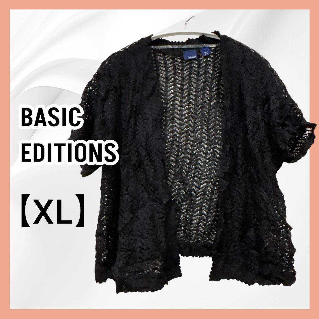 レース編みデザインのブラックカーディガン、100%アクリル製で軽やかに着こなせます。