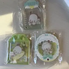 ハローキティ、ポチャッコ、シナモロールのキーホルダーセット。