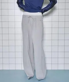 ストライプ柄のグレーのワイドパンツ、ラップデザインが特徴的。