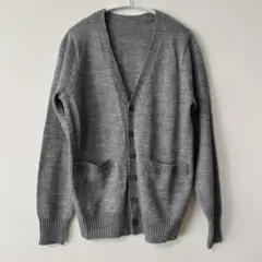 グレーのVネックカーディガン、前面ボタン留め、ポケット付き。