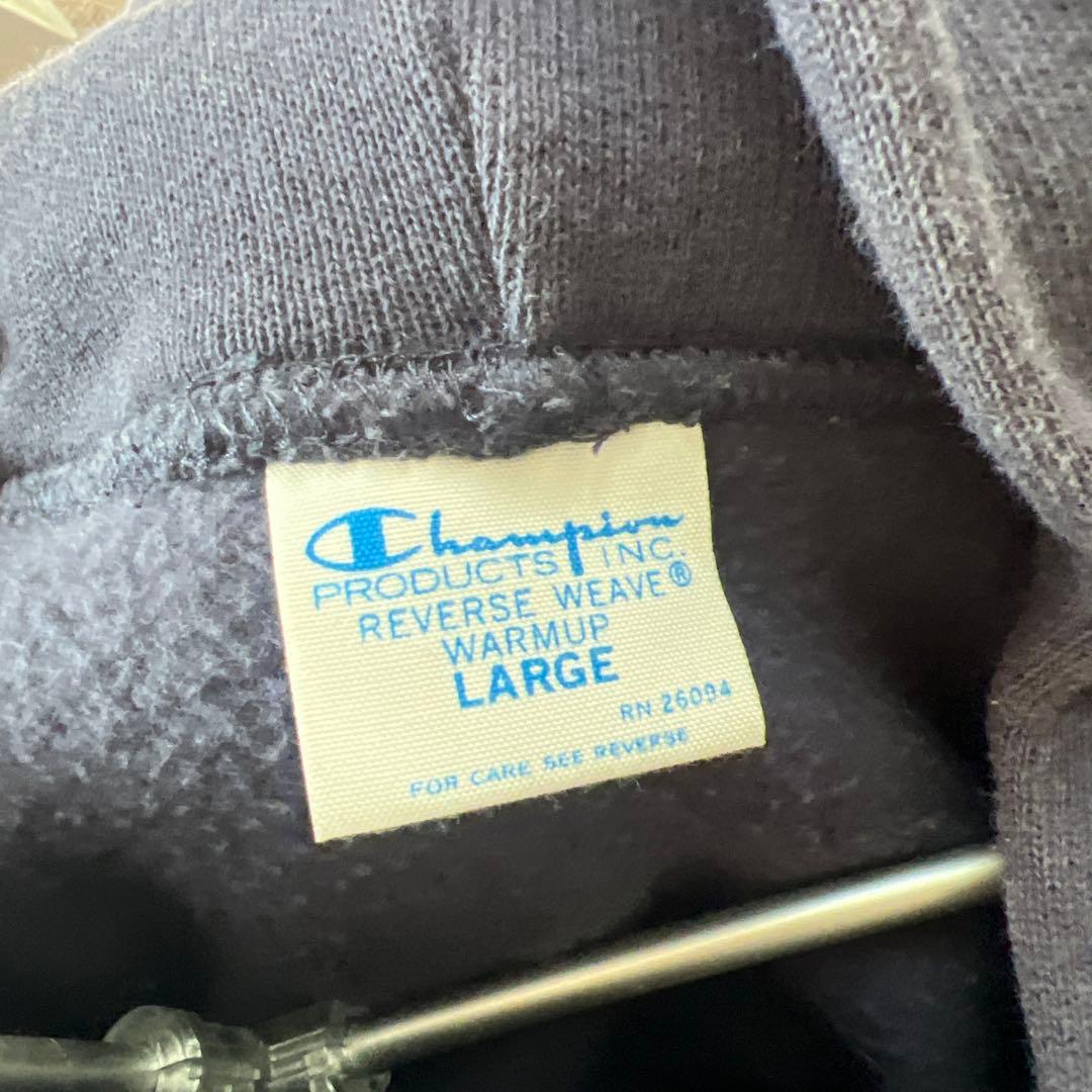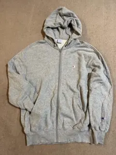 ネイビーのChampionフード付きパーカー、Lサイズ、ポケット付きで実用的。