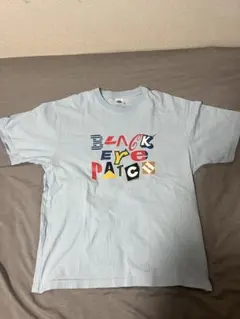 水色のTシャツに「THE BLACK EYE PATCH」のプリントデザイン。