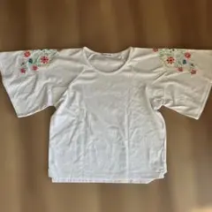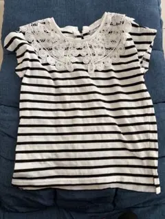 白と青のストライプデザインで、フリル袖が特徴のTシャツ。