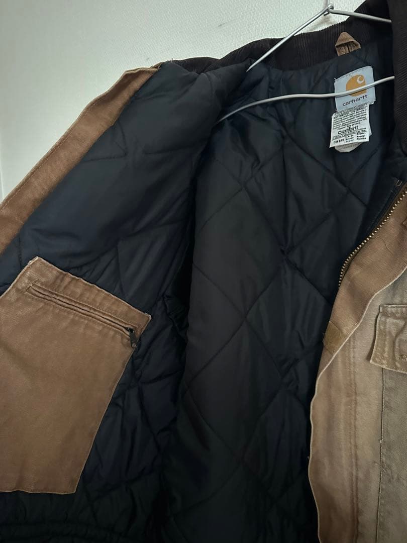 耐久性に優れたブラウンのCarharttジャケット、コーデュロイ襟付きでスタイリッシュ。