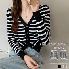 ボーダー模様のグレー系ニットカーディガン、3つのボタン付きでスタイリッシュ。