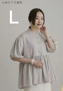 ベージュのしまむら製Lサイズ7分丈シアーシャツ、ボタン付きでバルーンスリーブデザイン。